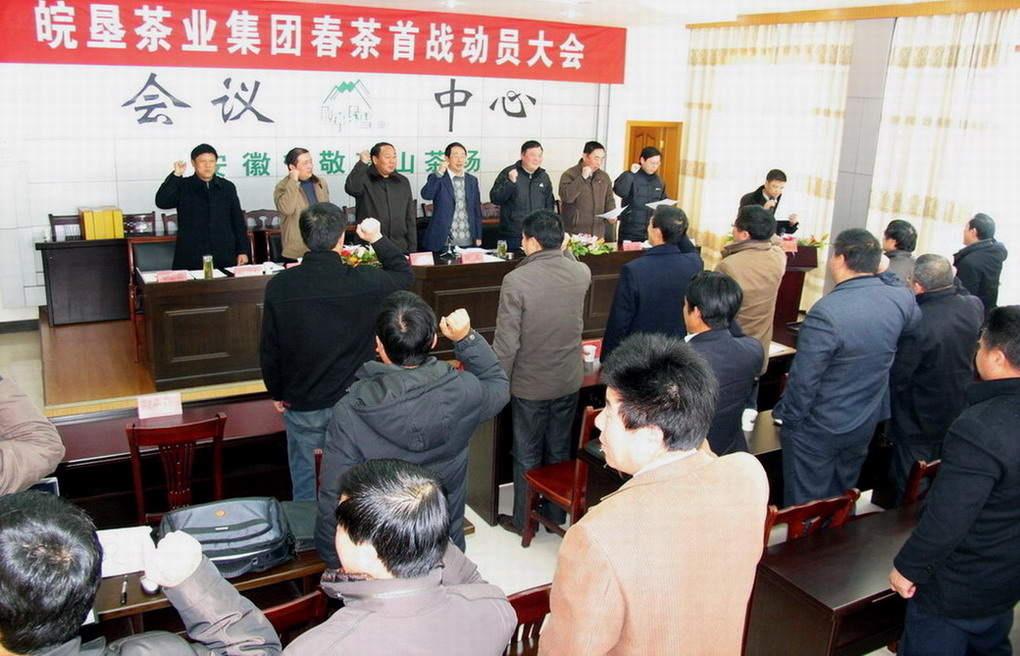 2010年3月10日上午10时50分,春寒料峭,雪后初晴,茶山银妆素裹,敬亭山茶场场部办公楼洋溢着激情和振奋,皖垦茶业集团公司在敬亭山茶场召开2010春茶首战动员大会。茶业集团董事会、监事会成员;茶业集团各场场长、分管生产副场长、生产科长、茶叶分场场长;绿魁公司、绿雪公司、翠剑公司经理、副经理及营销大户代表;集团机关部室负责人参加会议。 会议由省农垦集团副总经理、皖垦茶业集团董事长刘超主持,会议主要议程:1、茶业集团副总经理邱升水宣布2010春茶首战指挥部组成人员名单;2、茶业集团总经理孙国安作春茶生产总动员报告;3、茶区总场场长张国祥代表茶场作号召性发言、生产加工企业代表和基地分场代表分别作了表态性发言;4、省农垦集团公司农水处处长、茶业集团董事李运涛作技术指导讲话;5、茶业集团副总孙国安总经理代表茶业集团和指挥部做春茶生产总动员报告,提出了今年春茶首战工作的目标、任务和措施,他要求要以市场为导向,以质量为中心,以效益为前提,以历史名茶“敬亭绿雪”品牌为支撑,坚持好茶、好包装、好价格的“三好”原则,坚持统一品牌、统一生产工艺及质量标准、统一包装、统一销售政策的“四统一”政策,以敬亭绿雪公司为名优茶加工龙头,带动皖垦茶区名优茶生产,促进企业增效、职工增收。刘超董事长总结强调:召开这次春茶首战动员大会,主要希望与会同志认识再提高、思想再统一、精神再振奋、氛围再浓厚、任务再明确、措施再落实、纪律再严明。从现在开始,皖垦茶业集团上下要凝心聚力,调动一切积极因素,从人、财、物和产、加、销等各方面全力支持确保完成今年春茶首战任务。