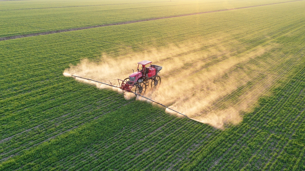 2月3日正值立春,潘村湖农场三、六分场统一经营田正在开展机械化喷防作业。(杨登宏  摄)