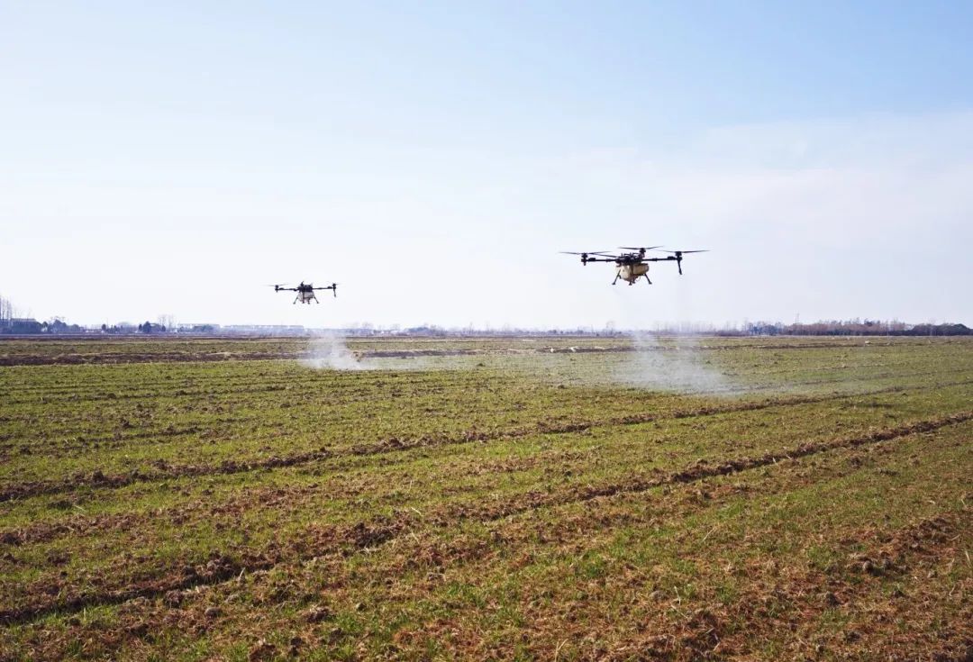 2月10日,数台植保无人机在大圹圩农场公司生产经营三部的麦田上空来回穿梭,精准喷洒叶面肥。连日来,大圹圩农场公司运用无人机巡田和无人机植保等先进技术,大幅提高田间管理效率和质量,确保管理精准到位,为春管工作提供有力支撑。