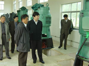 图为场领导徐成银、李家华、李斌等同志在检查工 程质量。(杨朝幸)