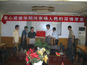 华阳河场长唐邦水、副场长胡兴兵带着2万名职工的 深 情厚意,将6万元人民币交给寿西湖农场场长刘国强 手 中,表达了对灾区人民的真挚慰问。
