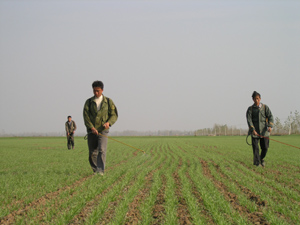 由于近期气温较高,麦田麦圆蜘蛛等害虫有爆发态 势。针对这一情况,连日来,潘村湖农场广大家庭 农场职工积极开展防治工作。图为二分场职工正在 田间喷药治虫。(杨登宏摄)