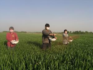 眼下正是小麦孕穗扬花期,切实抓好当前的田间管 理工作对有效防治小麦病虫害,增加穗数,提高穗 重,从而夺取午季作物高产具有重要意义。根据植 保部门提供的信息,今年潘村湖农场所在地区小麦 病虫害呈高发态势,特别是小麦吸浆虫、小麦赤霉 病等具有毁灭性的病虫害较往年偏重发生。针对这 一情况,农场及时与当地有关植保部门联系,通过 取样化验,共同会诊,制定了以“一撒两喷”为主 要内容的全场统一防治措施。4月18日,该场召开 由各农业单位管理人员及有关方面负责同志参加的 小麦生长后期田间管理专题会议,就切实做好小麦 病虫害统防统治工作做了周密部署。会议要求各分 场抓紧做好深入细致的宣传发动工作,动员各家庭 农场在规定时间内严格按照场农技部门制定的技术 措施统一行动,务求实效。从4月19日开始,全场 撒施“毒土”工作已全面展开。整个防治工作计划 到4月28日告一段落。图为4月19日下午,六分场胡 正萍家庭农场正在大田撒施“毒土”的情景。(杨 登宏摄 )