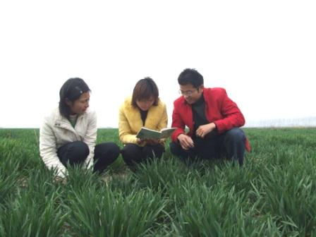 图为龙亢农场农科所科技人员定期检查记录小麦育种生长情况。