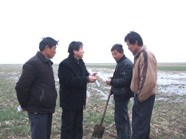图为:安徽农垦食品集团龙亢农场高级农艺师李庆堂在该场代管的褚圩村抗旱田地里向农民现场讲解小麦高产栽培水肥管理技术。