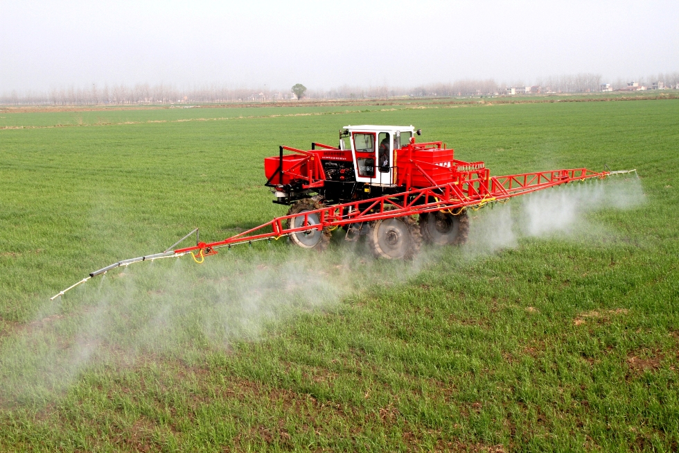 图为:龙亢农场一分场一家庭农场正在进行喷药化除防病。
