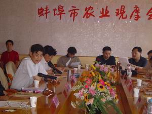 日前,蚌埠市农业工作会议到龙亢农场观摩,市委副 书记王晓淮、副市长何金良带领与会人员深入到龙 亢农场良种田、雁湖面粉有限公司实地观摩,并在 该场进行会议总结。图为总结会议会场。 (龙亢农场邵乃昌)